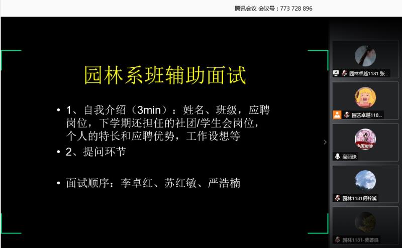 园林系通过腾讯会议平台举行了2020级的班辅助面试会议。全系共50余名2018级、2019级的报名者了参加本次面试。面试由辅导员助理张璇同学主持人,园林系辅导员高丽珠老师、欧成川老师以及四位2019级园林系辅导员助理担任评委。