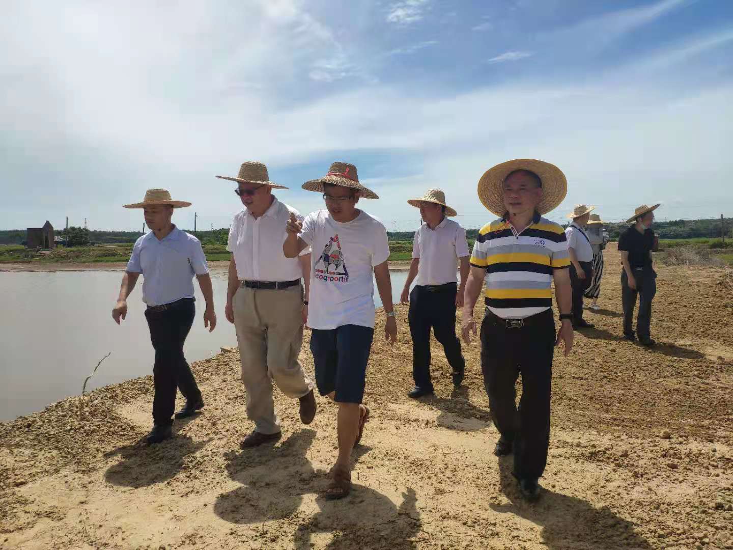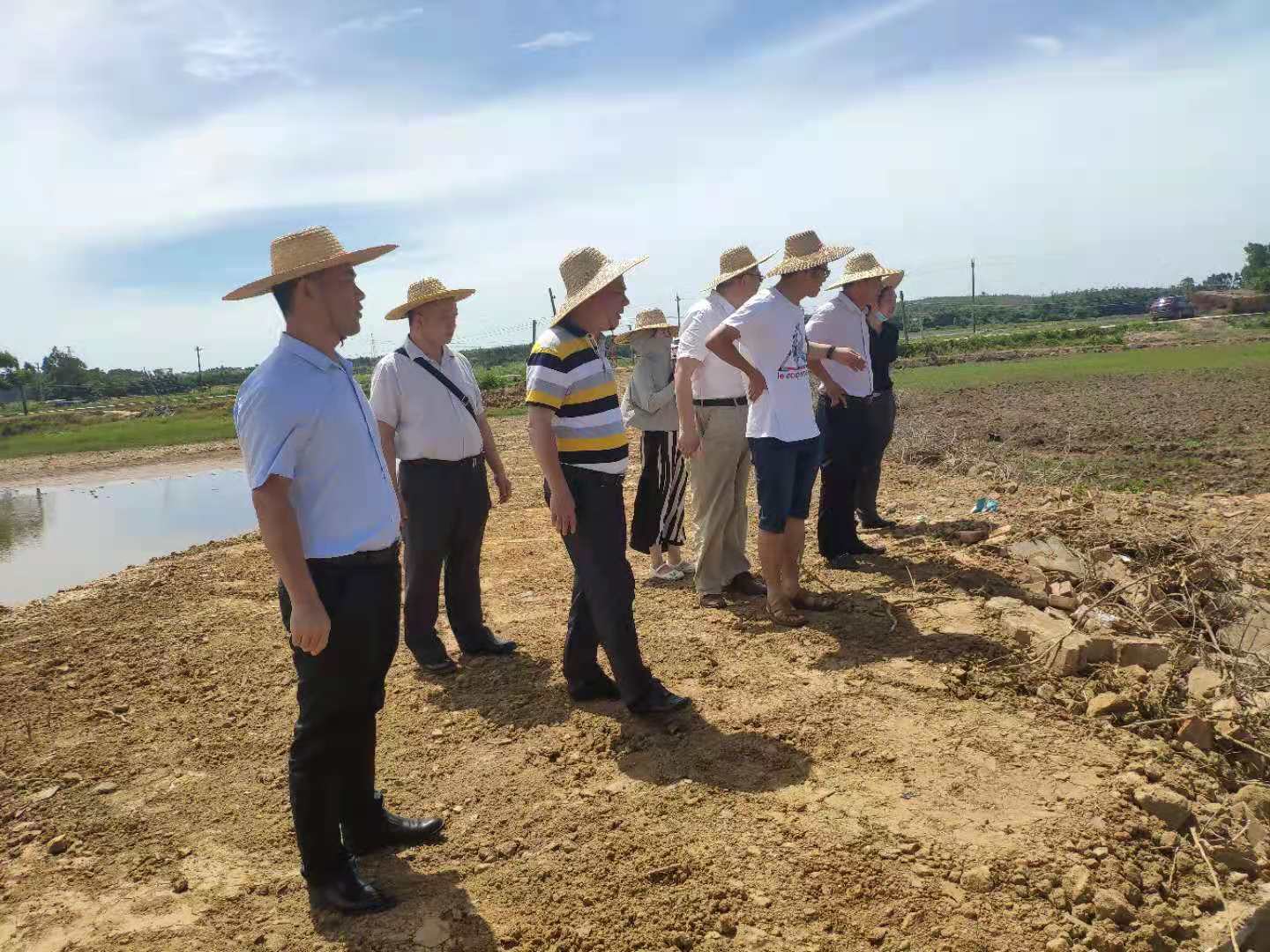 党委书记邓伟强、院长郑殿峰等的陪同下,前往位于东海岛下寮村的耐盐碱水稻基地考察基地建设情况。