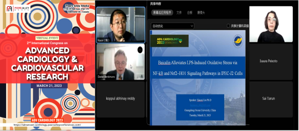 青年教师刘晓曦博士通过Cisco WebEx Meetings 以线上方式参会,并以“Baicalin Alleviates LPS-Induced Oxidative Stress via NF-κB and Nrf2–HO1 Signaling Pathways in IPEC-J2 Cells”为题做了学术报告。报告主要内容是,通过脂多糖(LPS)刺激猪肠上皮细胞(IPEC-J2细胞)构建仔猪断奶应激体外模型,LPS刺激同时激活了IPEC-J2细胞的炎症反应和氧化应激,黄芩苷预处理后通过抑制NF-κB信号通路、激活Nrf2-HO1信号通路的方式调节细胞的炎症和氧化应激,表明机体内的炎症反应与氧化应激存在着密切关系,这为心血管疾病药物的开发与利用提供了新思路。报告中,刘博士与美国田纳西州立大学的Daniel Berckmans教授进行了互动交流。