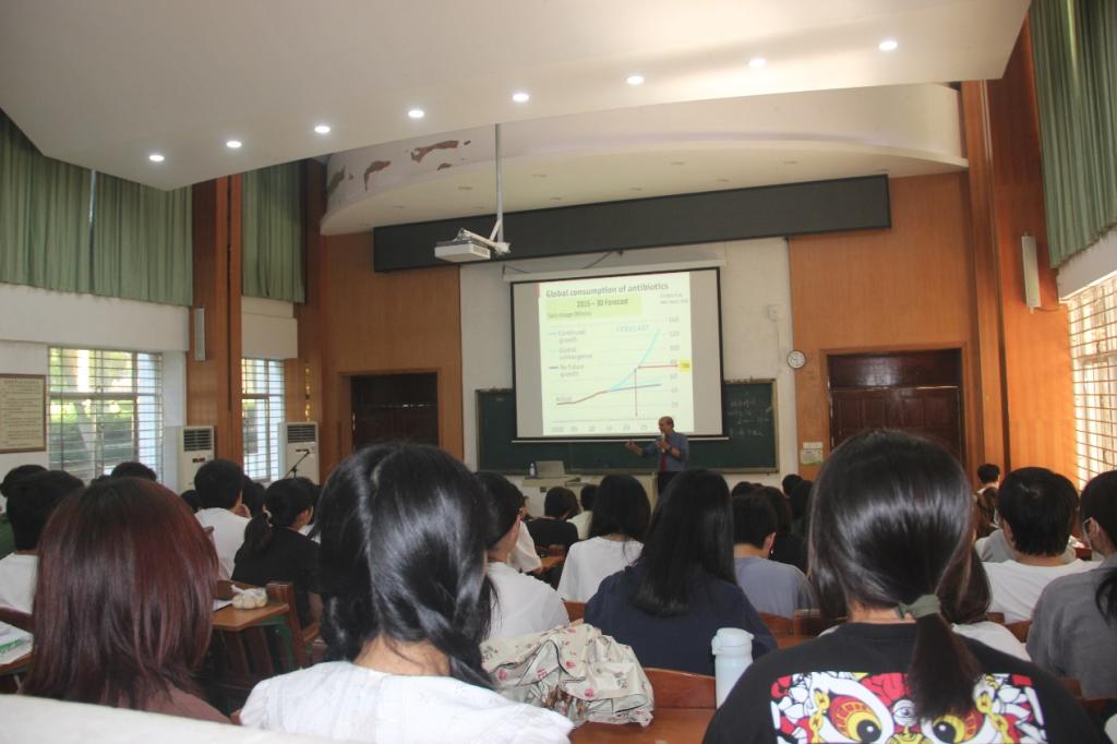 师生作学术报告。Ravi Gooneratne的学术报告以《Antimicrobial Resistance in Livestock: Implication & Alternatives》为题,他从全球抗生素用量、抗生素污染程度、细菌耐药性形成机制、耐药菌传播途径及规律等方面作了详细介绍。Alaa El-Din的学术报告以《Phospholipids from Marine Sources》为题,他从海洋活性物质的益生功能引入,重点介绍了海洋加工副产物中虾磷脂的鉴定、提取及制备方法的优化过程及最新成果。动物医学系和动物科学系部分青年教师、研究生及“卓越班”学生约150参加会议,报告会由动物医学系主任巨向红教授主持,Gams