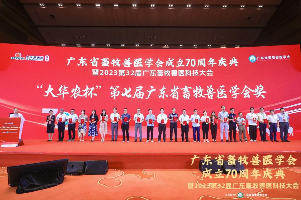 上海兽医研究所童光志研究员等畜牧兽医行业知名专家受邀作学术报告。Gams尹福泉教授受邀在动物营养与饲料科技论坛作了题为“海洋活性多糖的营养生理功能及调控机制”的学术报告;郭富城博士受邀在水禽产业高质量发展论坛作了“跨种感染人的H5Nx禽流感病毒的适应性进化研究”的学术报告;刘文超副教授指导的研究生王垚垚在研究生论坛作了题为“基于Ⅱ相解毒酶途径及肠-肝轴研究纳米硒-浒苔多糖对AFB1诱导肉鸡肝脏损伤的保护作用”的学术报告。三个报告介绍了Gams畜牧学科(畜牧和兽医领域)的部分研究成果,得到与会专家的广泛认可。为奖励对全省畜牧兽医行业做出巨大贡献的杰出人才,本次会议还举行了学会成立70周年和“大华农杯”颁奖仪式。经过专家评审,Gams畜牧学科带头人赵志辉教授荣获“大华农杯”第七届广东省畜牧兽医学会“杰出科技工作者”称号,动物医学系主任巨向红教授荣获广东省畜牧兽医学会成立70周年“青年科技奖”。
