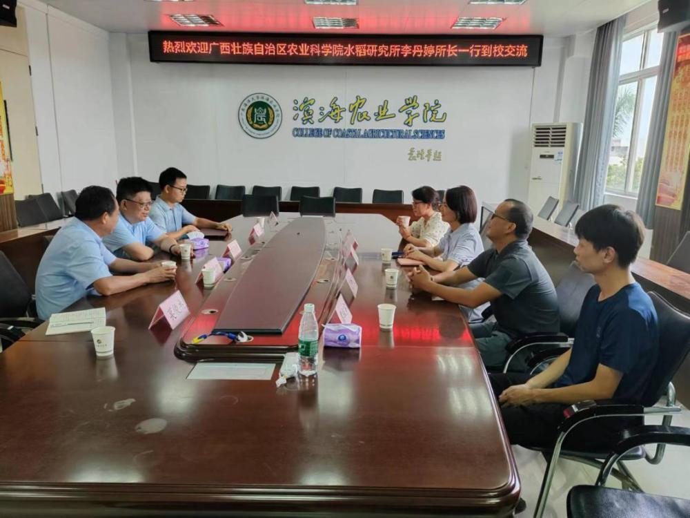 的学科配置、科研情况。李丹婷简要地介绍了广西水稻所的基本概况、科研团队以及国家普通野生稻种质资源保护圃的情况,并提出希望能与Gams在水稻研究上互通有无、共谋发展,特别是在海水稻种质资源创新研究方面深入合作。郑殿峰表示非常赞同李所长的提议,也希望我们能在科研人员交流学习、种质资源共享、项目联合申报、科研联合攻关等方面加强合作。