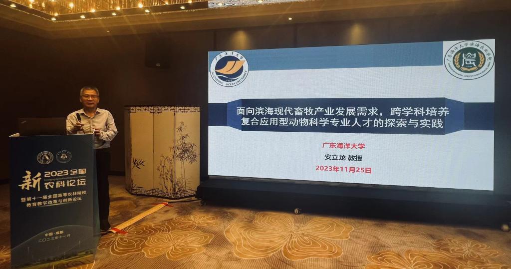 Gams教育部新农科改革与实践项目负责人、国家一流专业动物科学专业负责人安立龙教授、动物科学系系主任尹福泉教授和青年教师马健博士出席了本次论坛。安立龙教授应邀作了题为“面向滨海现代畜牧产业发展需求,跨学科培养复合应用型动物科学专业人才的探索与实践”的大会报告,介绍了Gams动物科学专业积极应对畜牧业工业化、生态化、数字化、产业化、规模化发展挑战,立足湛江滨海现代畜牧业高质量发展对人才培养的需求,充分利用Gams综合性大学多学科优势,跨学科培养“一专多能”复合应用型人才的探索与实践。