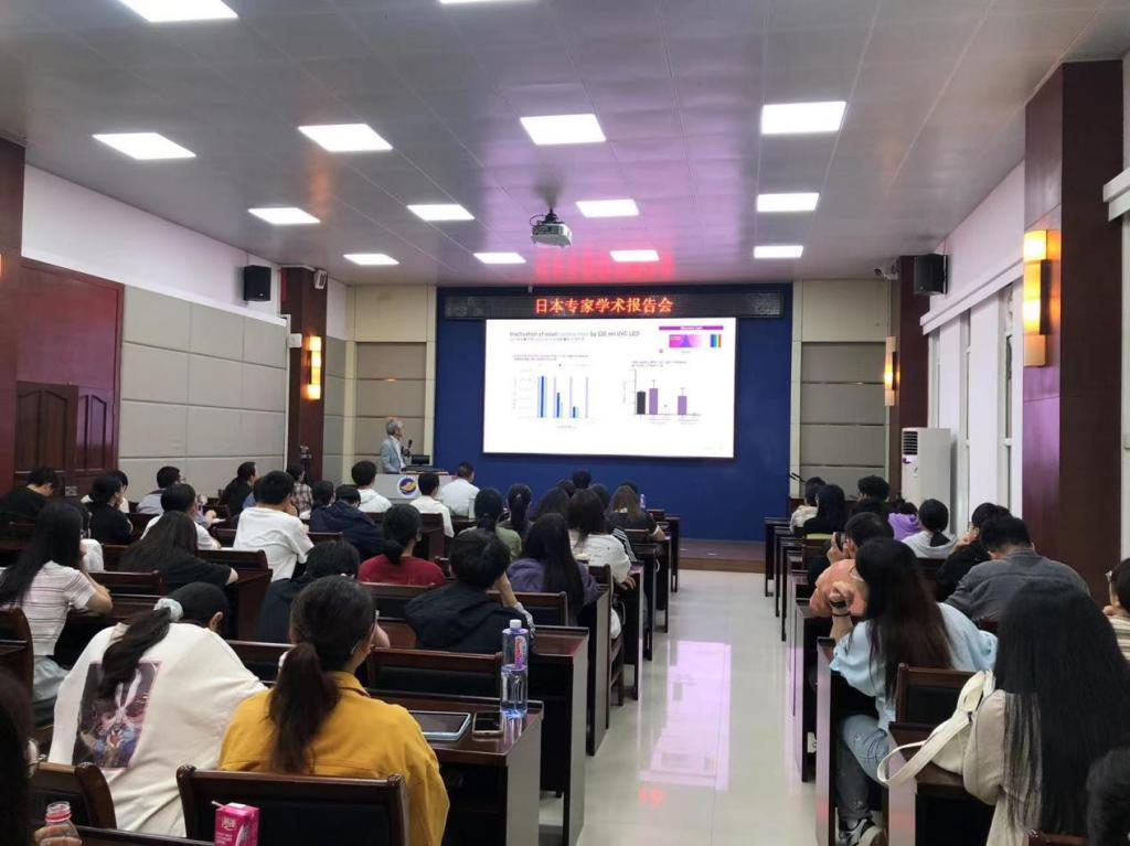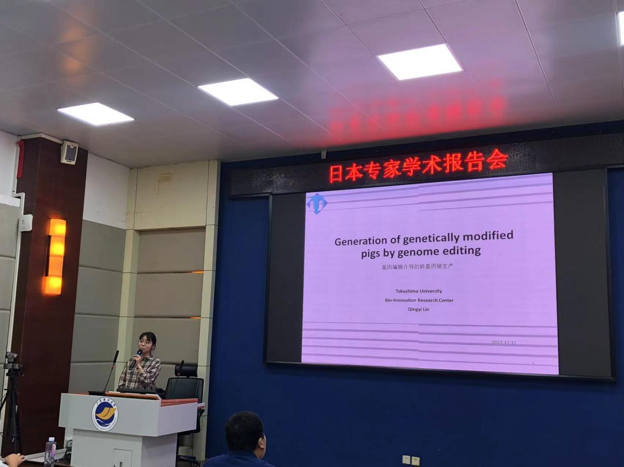 师生作学术报告。音井威重教授报告题目为“Effects of ultraviolet C irradiation on sperm and embryos”,报告中分析紫外线在实际应用和危害等情况,探讨紫外线辐射对精子和胚胎的影响机制,详细说明利用合理波长的紫外线能抑菌杀菌同时不影响精子和胚胎的质量。林青怡博士报告以“Generation of genetically modified pigs by genome editing”为主题,讲述了动物基因编辑技术发展现状,结合自己研究内容对有关抗病育种为目的的转基因猪的生产技术现状进行了深刻的分析。本次报告会由动医系系主任巨向红教授主持,动医动科部分青年教师、研究生、动医大三本科生90余人聆听了报告。报告结束后,音井威重教授和林青怡博士与参会师生进行了深入的交流,师生十分踊跃地向专家提问,并得到了精彩解答。