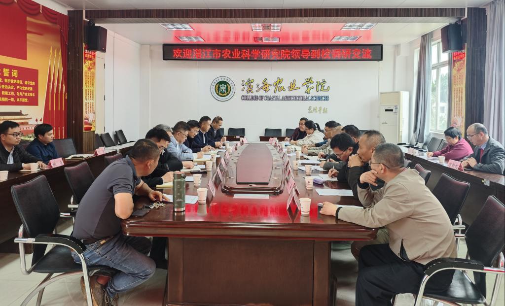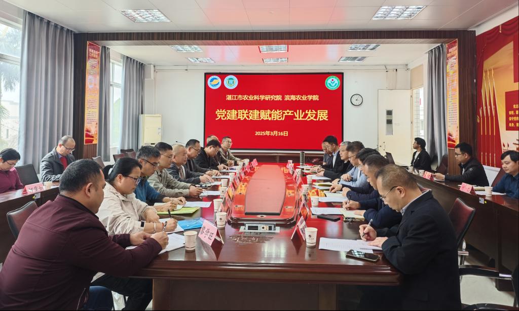 郑书记对陈院长一行的到来表示热烈欢迎。在双方相互介绍了各自单位的基本情况后,分别就科研平台建设、科技成果转化、青年人才成长、创新人才培养等方面存在的问题展开讨论,提出“团队互融、平台共享、机制共建”的合作新模式,并达成合作意愿。两位院长一致表示,在党建引领下,深化务实合作,助力科技创新和产业创新,赋能湛江农业高质量发展。