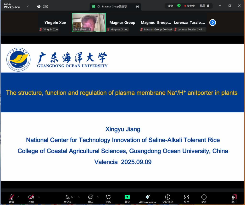 会议期间,江行玉教授作了题为“The structure, function and regulation of plasma membrane Na⁺/H⁺ antiporter in plants”的主题报告。报告揭示了Na+/H+逆向运输蛋白SOS1是植物细胞膜上重要的Na+外向运输蛋白质;阐明了盐胁迫条件下,钙信号蛋白CBLs(CBL4,CBL5,CBL10)通过和蛋白激酶CIPKs(CIPK8, CIPK24)互作,进一步使细胞膜SOS1磷酸化激活其外排Na+的活性,从而降低细胞内Na+含量,增强植物耐盐性的分子机制。该项研究获得与会专家的高度评价。郑殿峰教授、冯乃杰教授和薛迎斌副教授提交了论文摘要,并以学术海报展示了研究成果,引发同行广泛关注。