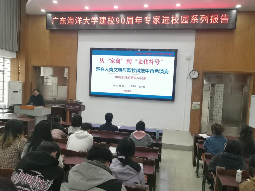 和现代滨海畜牧产业学院在湖光校区兴农楼109室举办“建校九十周年企业专家进校园系列报告”的第三场。特邀国民健康膳食营养研究室主任、北京大学全球健康发展研究院特聘研究员、善方国医研究院轮值院长、山东省特聘海智专家孟祥兵研究员为学院师生作报告,报告会由动物科学系主任尹福泉教授主持,学院青年教师、研究生及本科生近百人聆听报告。