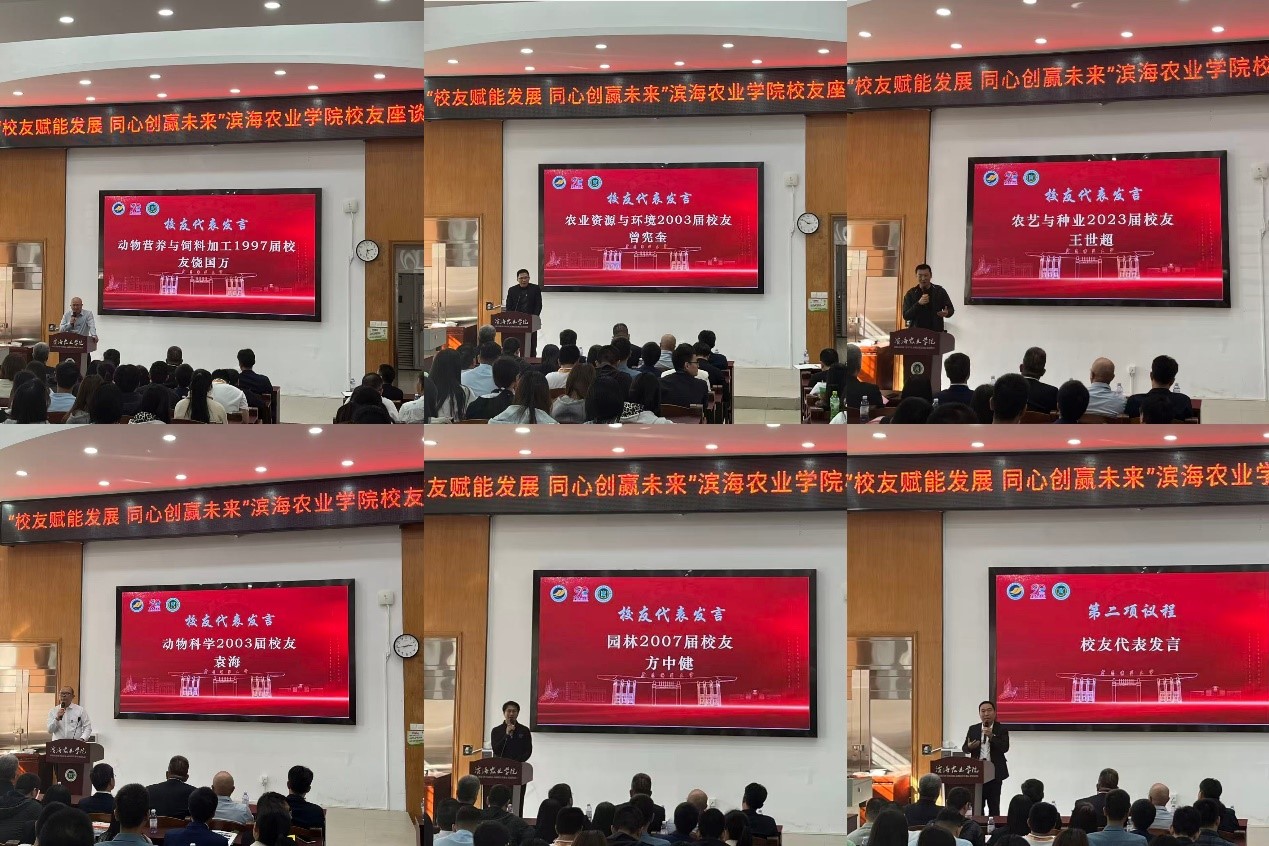 在交流分享环节,六位跨越不同年代的校友代表依次发言,结合各自成长轨迹与行业洞察,分享感悟、建言未来。从1997届饶国万校友强调的“专业深耕与资源整合”,到2003届袁海校友看重的“沟通素养与前沿视野”;从同届曾宪奎校友“惜时追梦、锤炼素养”的真诚勉励,到2007届方中健校友提出的“守正创新、跨界融合”发展理念;再到王世超校友以水稻育种实践诠释学科精神的接续传承,以及1991届王华强校友通报捐赠进展所体现的深厚情谊——不同年代的奋斗故事,共同凝结为“感恩母校、回馈行业、矢志奋斗”的精神主线,展现了滨海农院校友群体历久弥新的凝聚力与担当。