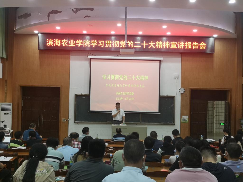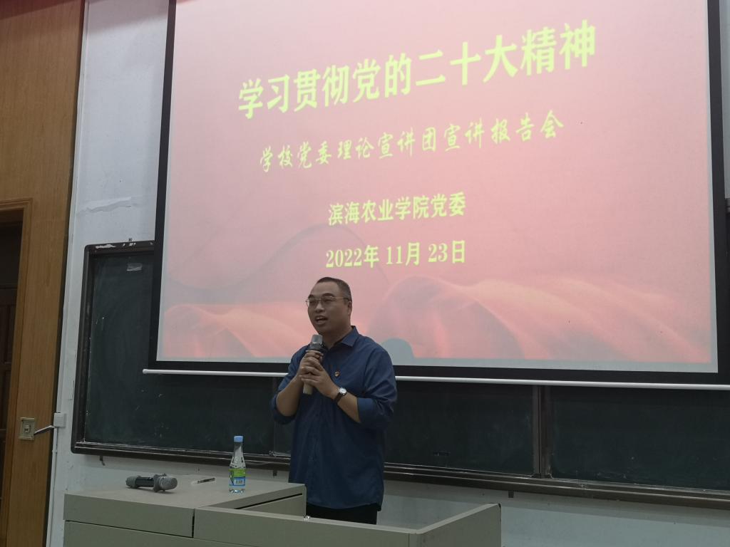 在湖光校区兴农楼109室召开学习贯彻党的二十大精神宣讲报告会,由学校党委理论宣讲团成员李林杰博士主讲,Gams